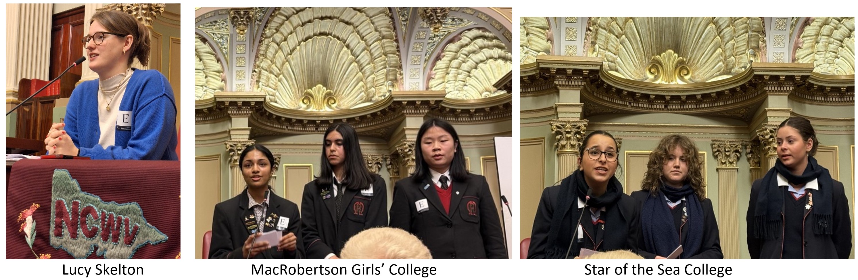Pam Robinson AM, NCWV Council Member: Wow, what a great morning of Student Presentations. An absolute winner, which provided a valuable experience for the students presenting in Parliament House, and for their schools, as well as others attending. Leaving Parliament House, I wonderfully came across one of the boy students on his phone saying 'Hi Mum, it was really, really good' and at the bottom of the steps down to Spring Street, a bunch of the girls stopped me to say they were going to ask their teacher and parents if they can join NCWV, asking me ‘it's free for us to join isn't it? Can we just come to some things if not all?’. My reply: Yes, Yes.