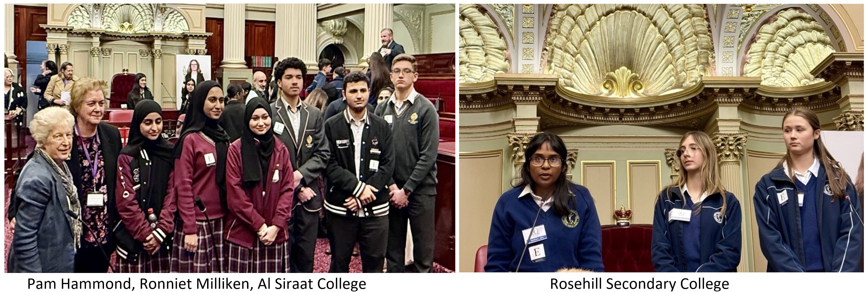 An evaluation sheet was completed by panel members (and others). Panel members were Cr Coral Ross OAM, Mayor Boroondara and President of MAV; Cr Sandra Wilson, past Mayor of Hobsons Bay; Cr Trent McCarthy, Darebin Council, with Dr Deborah Towns OAM chairing. In addition to this feedback, we have audio of the event provided by the Hansard staff at the Parliament. The following schools have received awards: