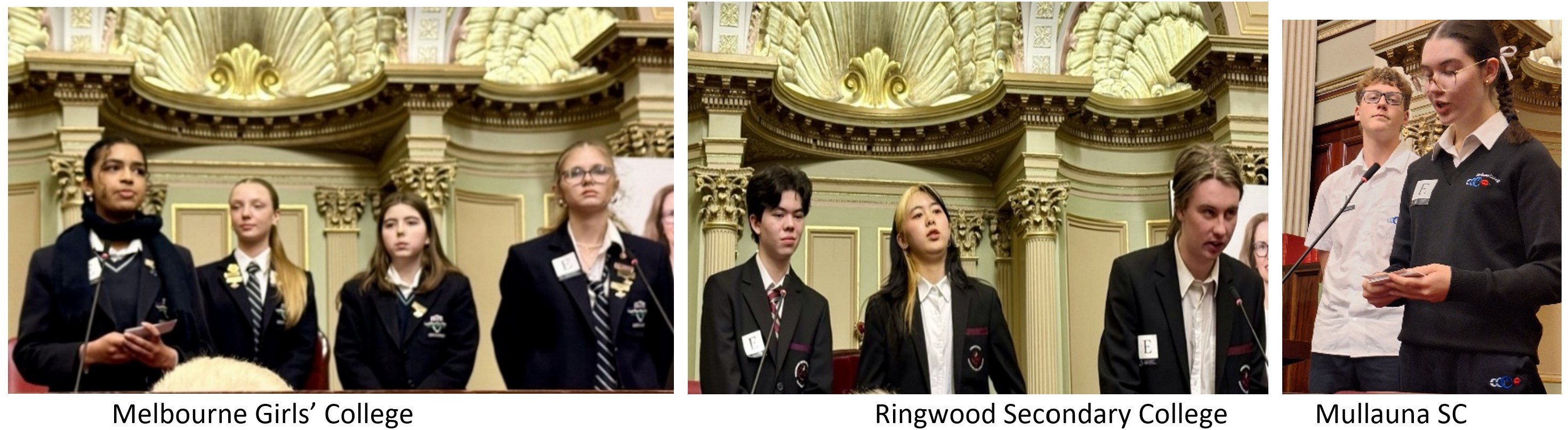 An evaluation sheet was completed by panel members (and others). Panel members were Cr Coral Ross OAM, Mayor Boroondara and President of MAV; Cr Sandra Wilson, past Mayor of Hobsons Bay; Cr Trent McCarthy, Darebin Council, with Dr Deborah Towns OAM chairing. In addition to this feedback, we have audio of the event provided by the Hansard staff at the Parliament. The following schools have received awards: